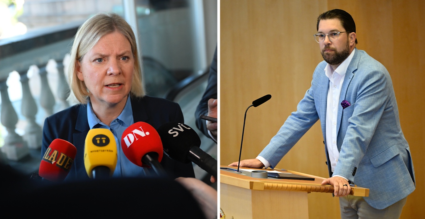 Magdalena Andersson (S) inför debatten/Jimmie Åkesson (SD) under debatten. (TT)