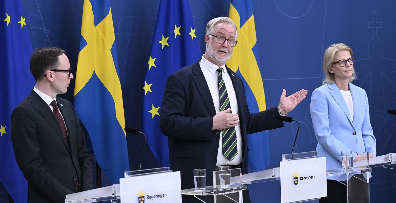 Förutom Johan Pehrson medverkade finansminister Elisabeth Svantesson (M) och utbildningsminister Mats Persson (L) på pressträffen.
