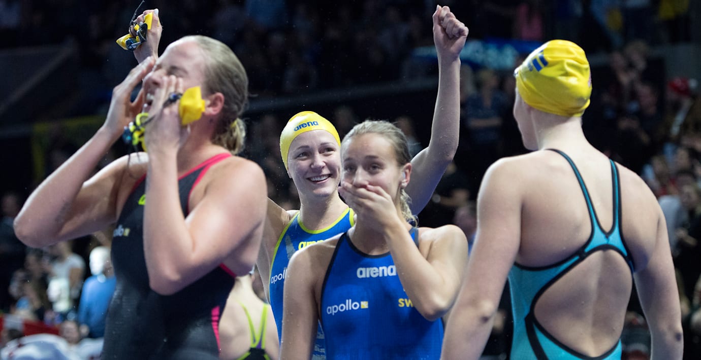 17-åriga Hanna Rosvall fick chansen att starta lagkappen i sitt andra seniormästerskap. Ängelholmssimmaren gjorde ett bra ryggsim och fick sedan se sina lagkamrater simma hem guldet till Sverige.