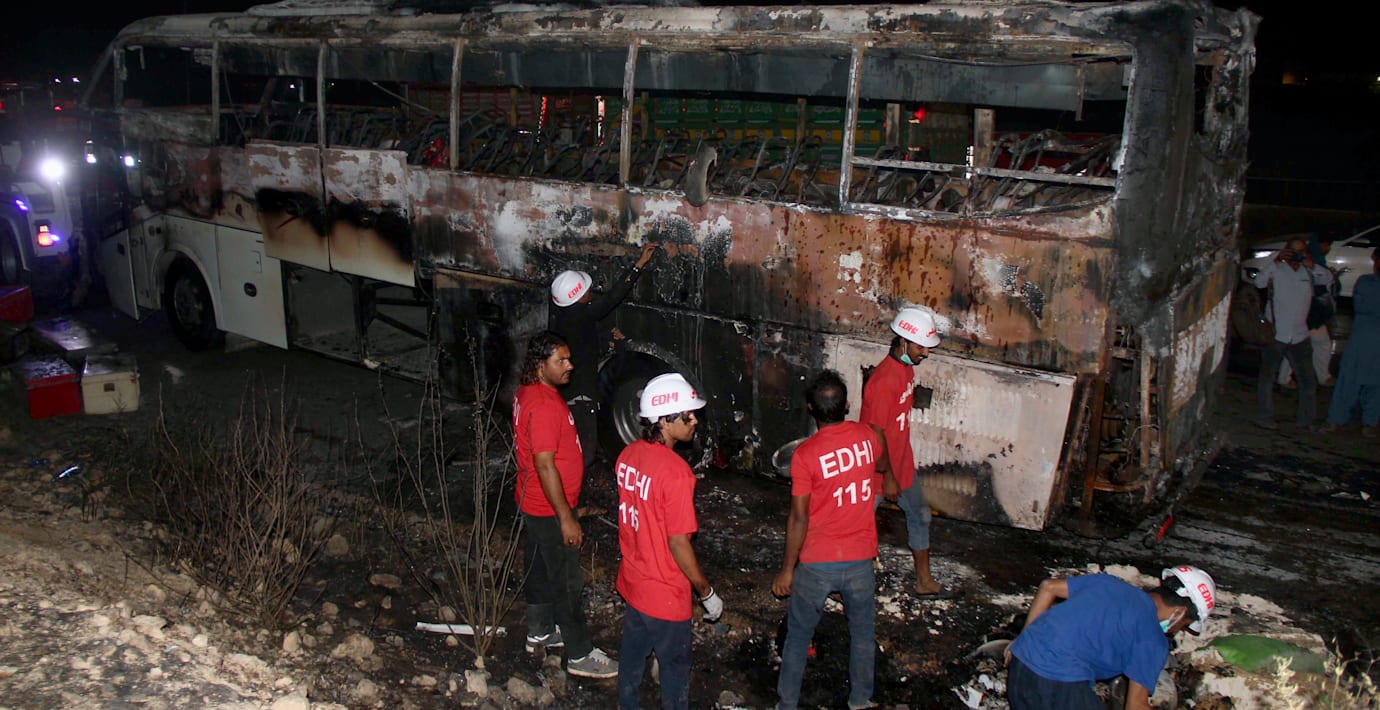 Minst 18 människor, varav 12 av dem var barn, dog när en buss de färdades i började brinna i närheten av hamnstaden Karachi i Pakistan, skriver AFP. Gruppen var på väg hem efter att ha sökt skydd på annan ort från de katastrofala översvämningar som drabbat landet.