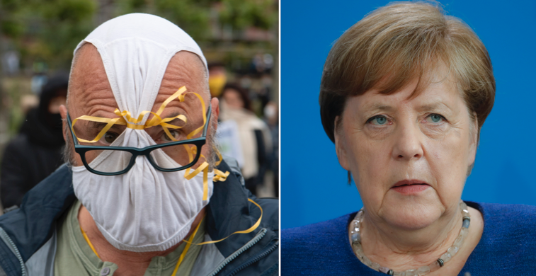 Demonstranterna menar att Angela Merkels virusrestriktioner är för tuffa och de uttrycker oro för att reglerna slår mot de mänskliga rättigheterna.