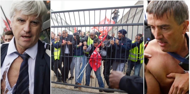 Krisdrabbade Air France personalchef Xavier Broseta fick skjortan sliten från kroppen och på en annan chef hängde kavajen i trasor. Tillsammans fick de fly hals över huvud över ett staket från ett möte i Paris angående företagets sparkrav.