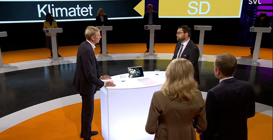 – Du hänvisar hela tiden till Sveriges mål, men vi har inte ens en promille av världens utsläpp. Satsa i stället på det som vi vet gör nytta och som är mer angeläget än plastpåseskatt, säger Åkesson när han debatterade mot Per Bolund (MP) i partiledardebatten i SVT.