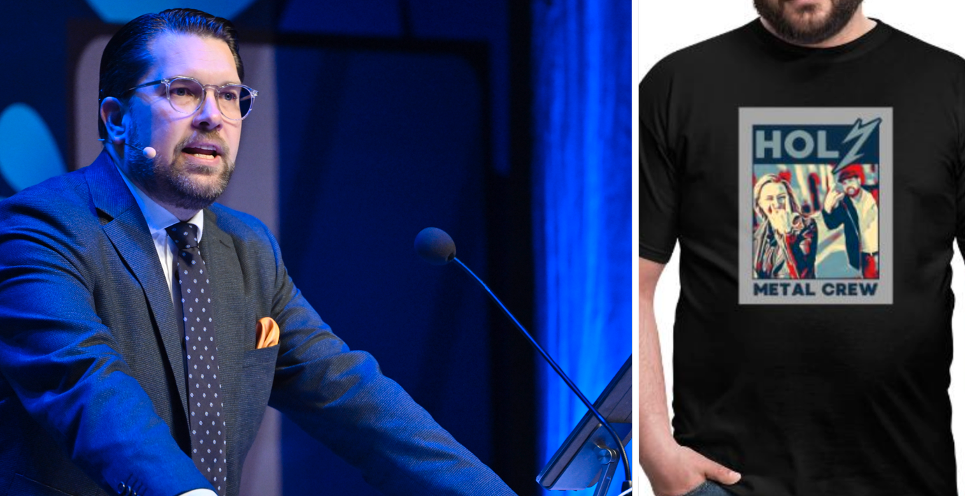SD-ledaren Jimmie Åkesson har börjat sälja t-shirts med den uppmärksammade bilden där han och KD-ledaren Ebba Busch gör så kallade djävulstecken, eller hårdrockstecken, med handen. Det rapporterar Aftonbladet.