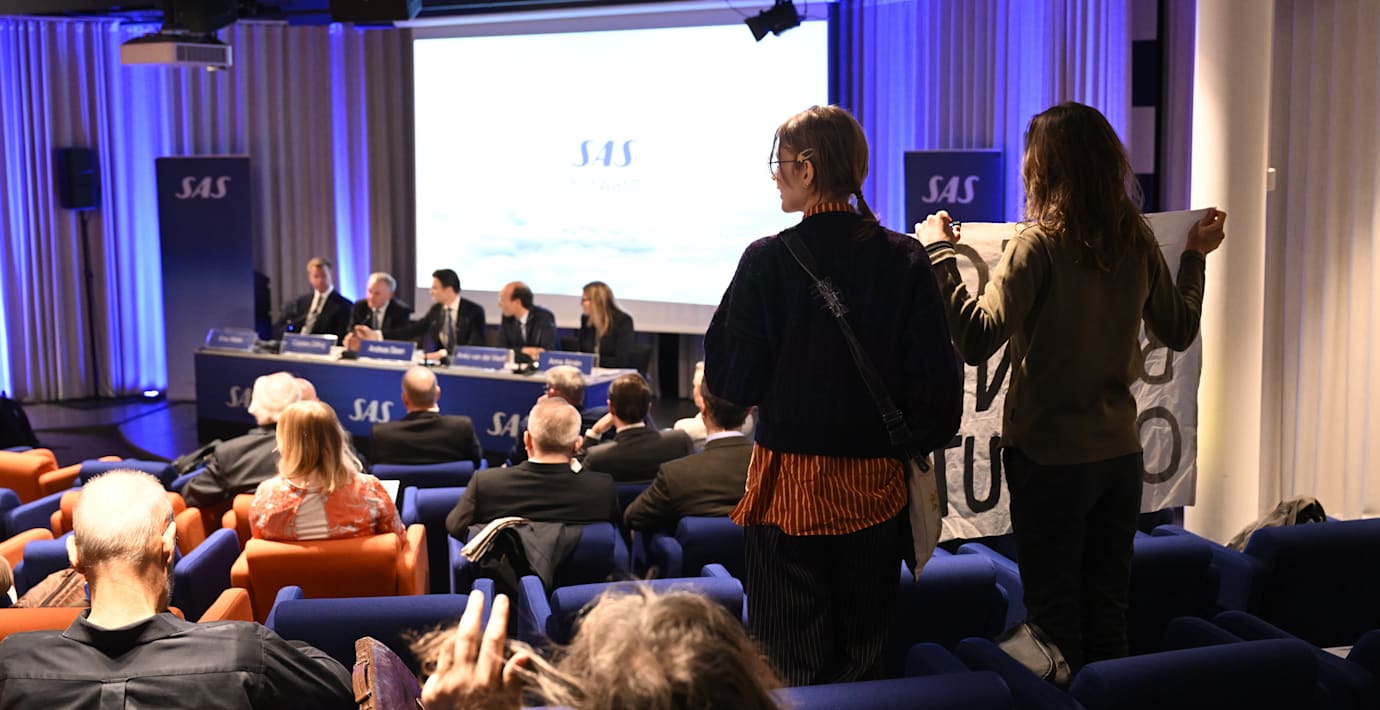 Aktiespararnas vd Joacim Olsson är kritisk till Greta Thunbergs klimataktion på gårdagens SAS-stämma.