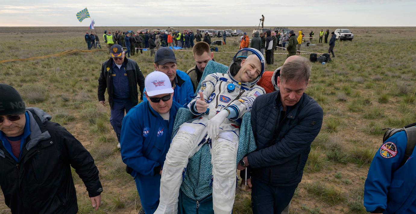 Rymdkapseln Soyuz MS-26 tog Pettit och hans besättningskamrater Aleksej Ovtjinin och Ivan Vagner ner till jorden med en fallskärmslandning på stäppen i Kazakstan.
