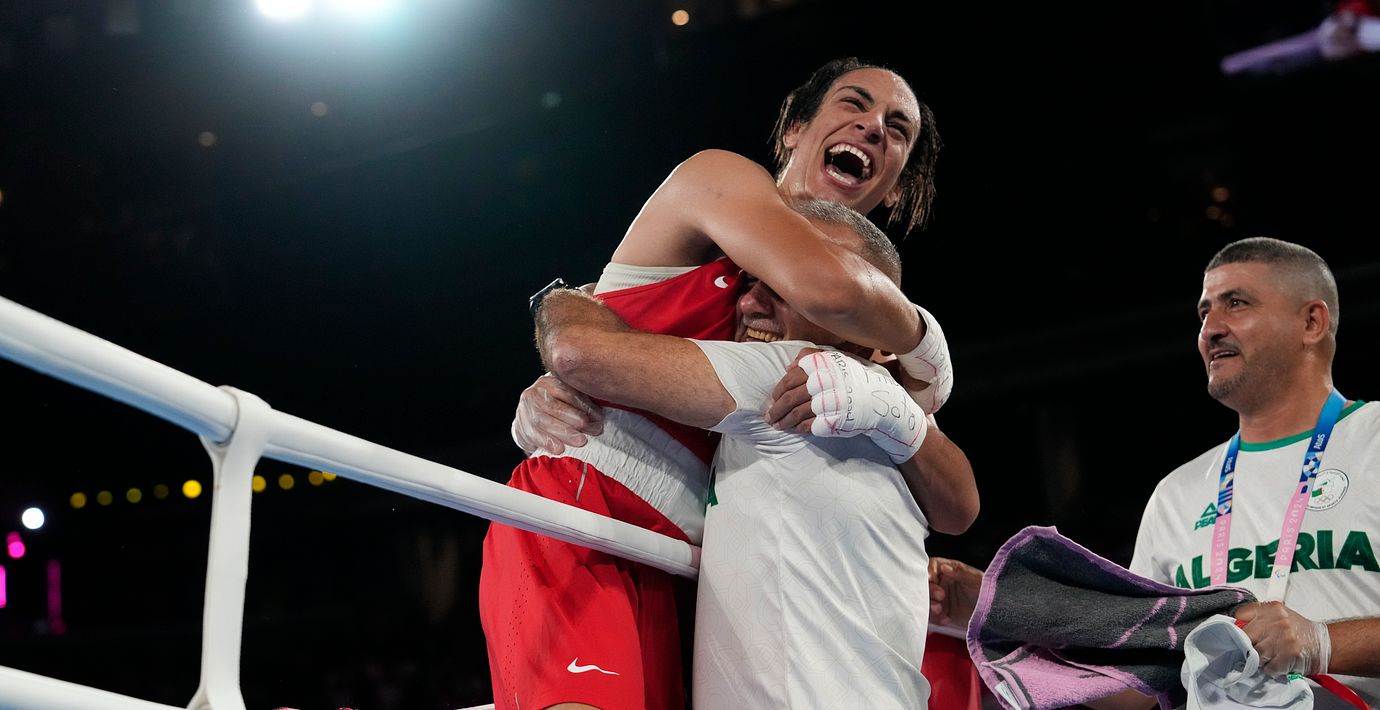 Den algeriska boxaren Imane Khelif firar guldsegern i sommar-OS i Paris 2024. Efter en lång kontrovers om hennes könstillhörighet infördes obligatoriska könstester av Internationella boxningsförbundet i fjol. Hon stoppas nu från att tävla. (Ariana Cubillos / AP)