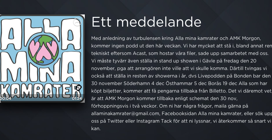 Podplattformen Acast har beslutat att humorgruppen Alla mina kamrater inte längre får sända sin podcast där. Tidigare har modekedjan Åhléns avbrutit samarbetet med humorgruppen sedan det uppmärksammade och kritiserade podavsnittet där Kristoffer ”Kringlan” Svensson tilläts uttala dödshot och obsceniteter mot Aftonbladets kulturchef Åsa Linderborg.