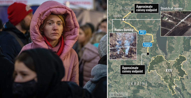Peter Beaumont skriver i The Guardian om satellitbilderna, och att den stora kolonnen kan vara en förvarning om att ett ryskt försök till belägring är att vänta. Analytiker och underrättelsetjänster i väst tror sedan på ett försök från Kreml att installera en marionettregering i Kyiv, skriver Beaumont.