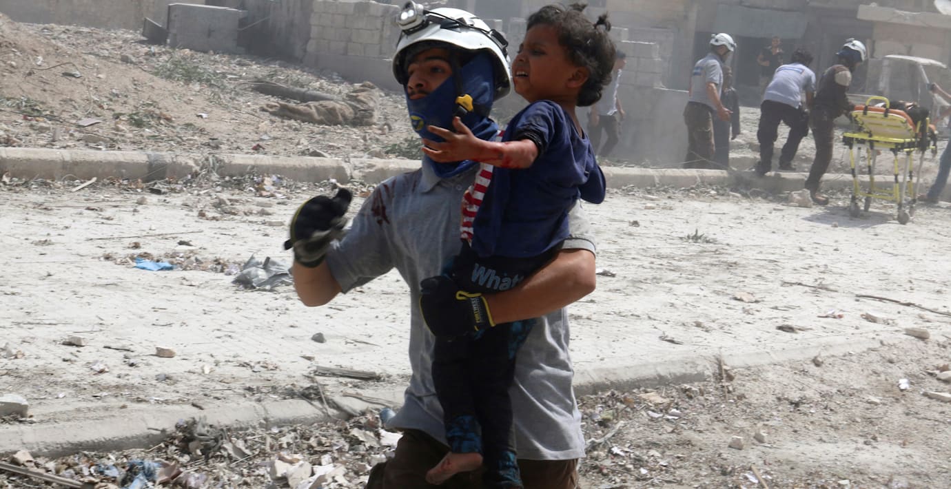En man bär en skadad flicka i Aleppo efter flyganfall. (ABDALRHMAN ISMAIL / TT NYHETSBYRÅN)