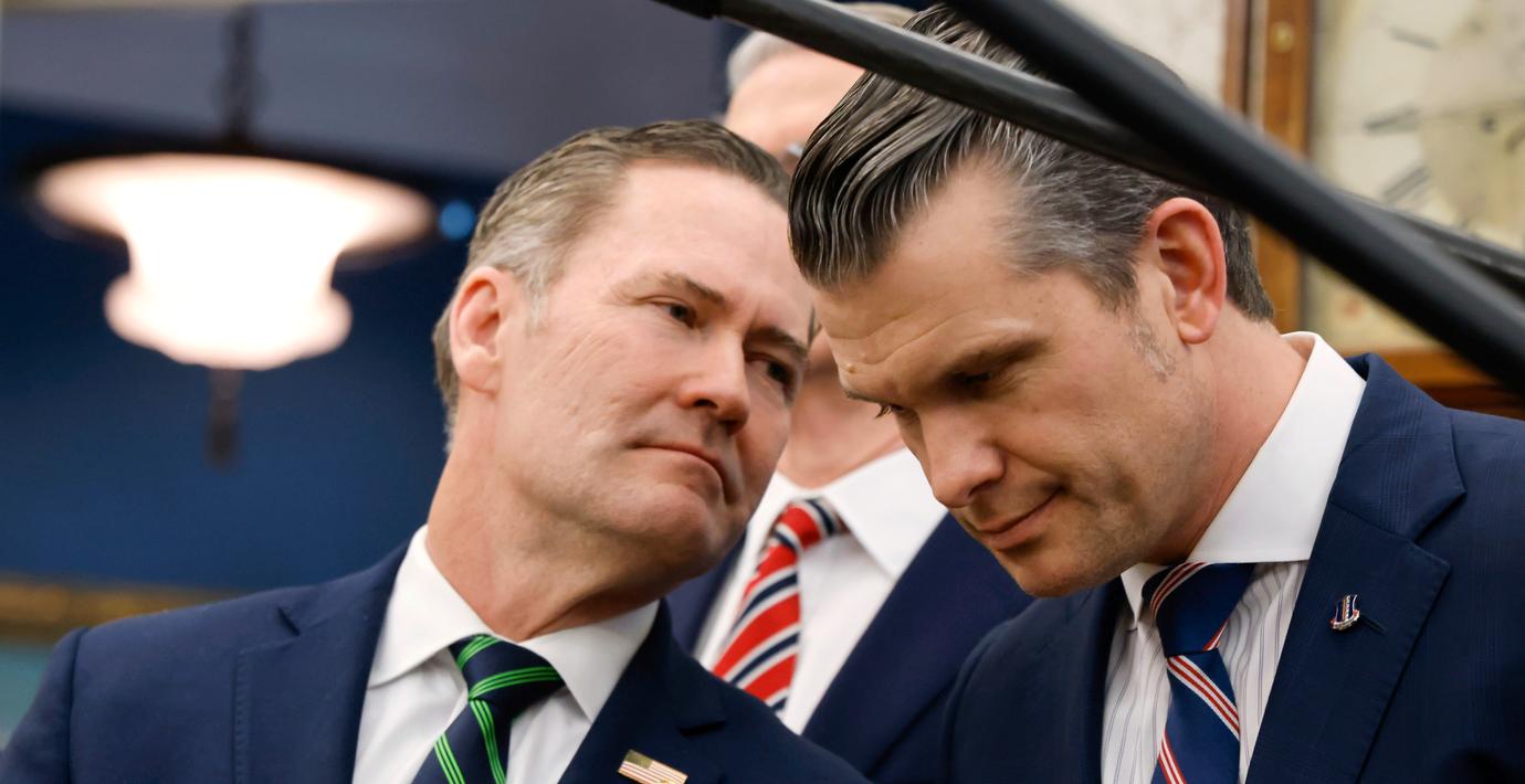 Vita husets nationella säkerhetsrådgivare Mike Waltz talar med försvarsminister Pete Hegseth. (Ludovic Marin / AP)