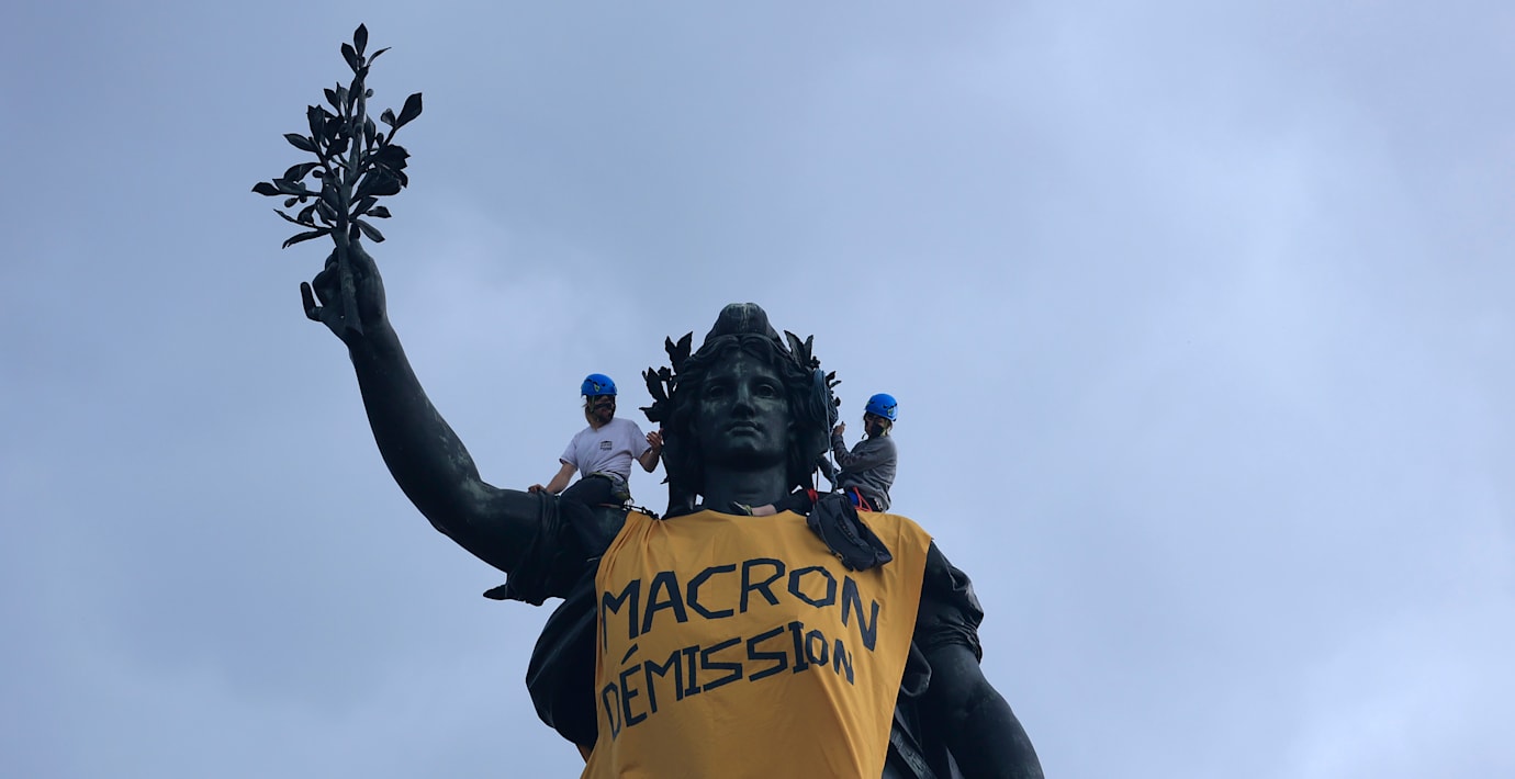 Han skriver att det stora motståndet Macrons regering möter samtidigt som presidenten inte har gett med sig ”ens en tum” riskerar att lamslå hans mandatperiod.