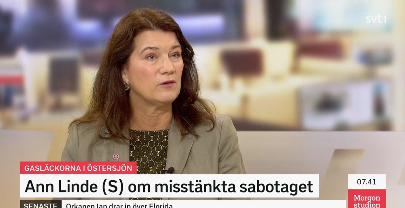 Utrikesminister Ann Linde (S) säger i SVT att gasläckan från Nord Stream är en både väldigt ovanlig och väldigt oroande händelse.