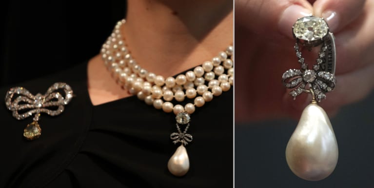 Ett pärlhänge med diamanter värderades till 10–20 miljoner kronor inför försäljningen men såldes för 328 miljoner till en anonym köpare. Det är enligt auktionshuset Sotheby’s rekord för en pärla.