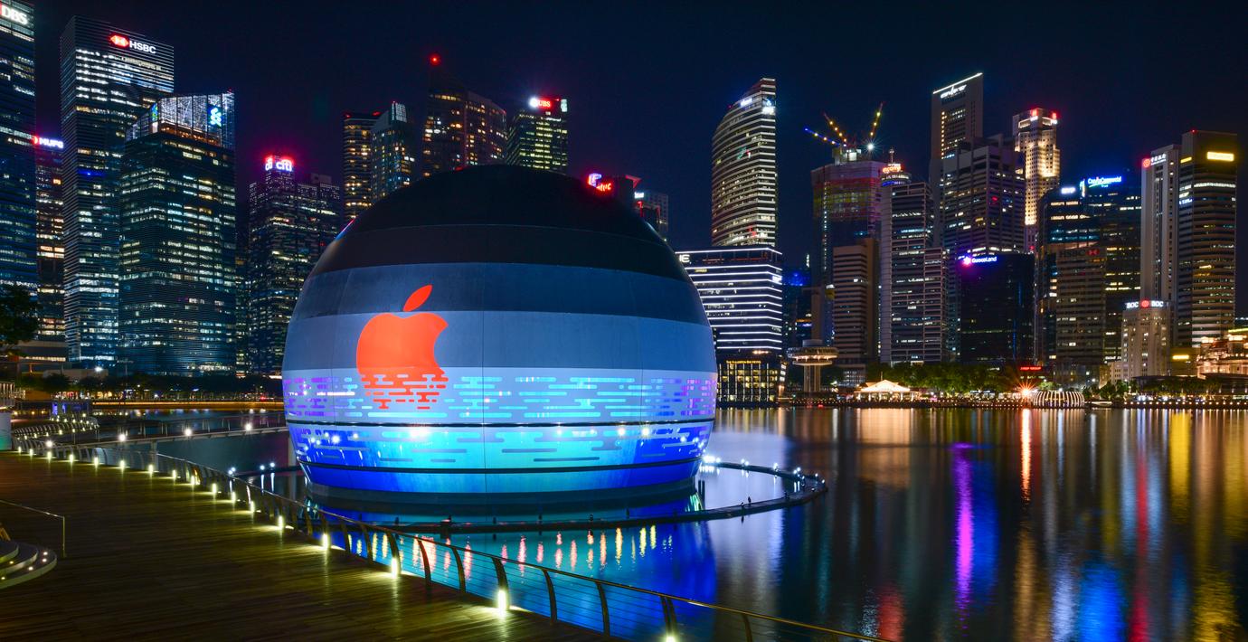 Apples uppmärksammade flytande butik i centrala Singapore kommer att öppna på torsdag. Det har Apple meddelat via ett inlägg på sin sajt. Den spektakulära butiken – som har en sfärisk design och som tycks glöda i mörkret – består bland annat av 114 böjda glasplattor och skiljer sig på flera sätt från Apples andra flaggskeppsbutiker i världen. Butiken har till exempel en undervattensanslutning till det intilliggande köpcentret vid Marina Bay Sands, och dessutom finns ett konferensrum under vattenytan.