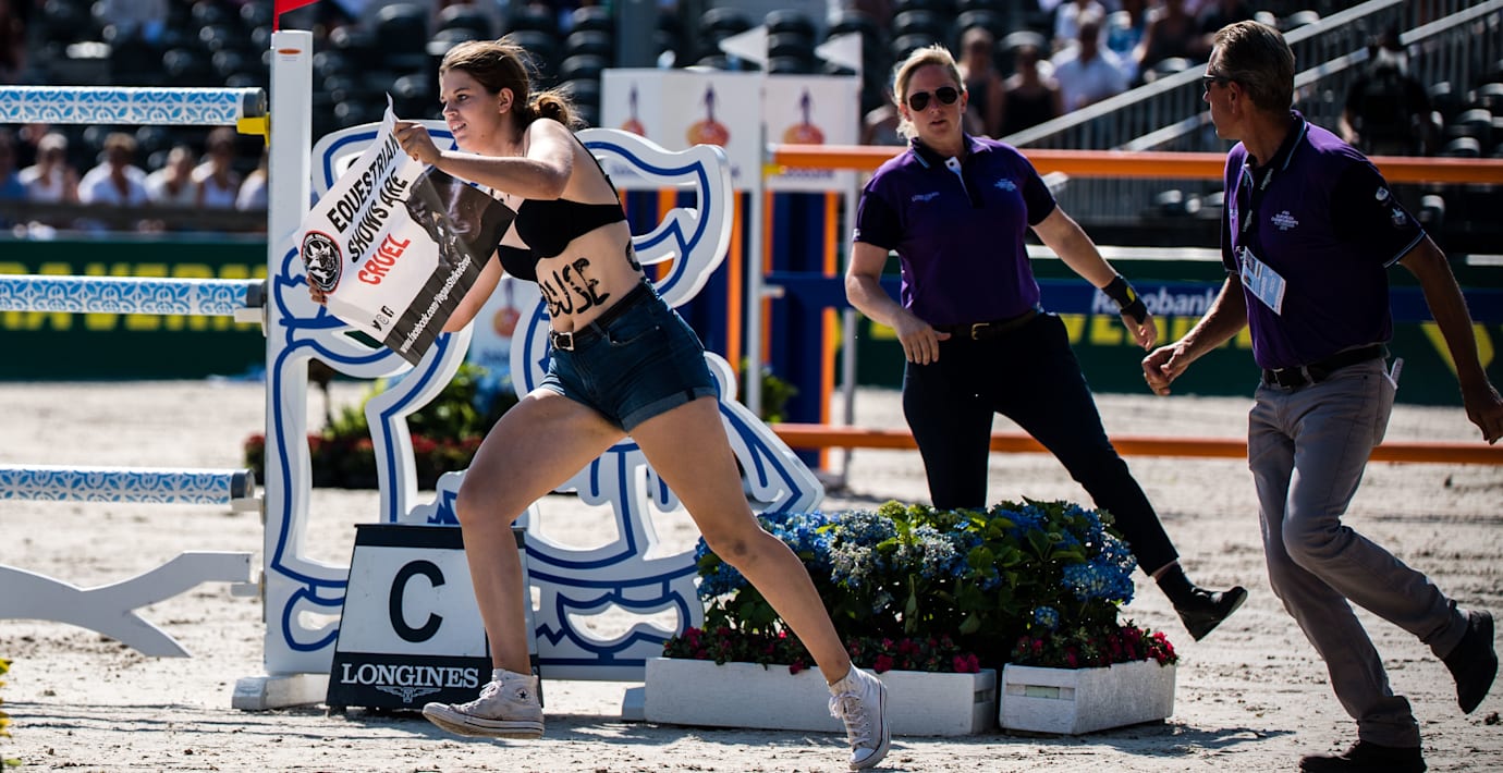 Under EM-finalen i hoppning i Rotterdam sprang en kvinna in på banan i protest mot ridsporten.