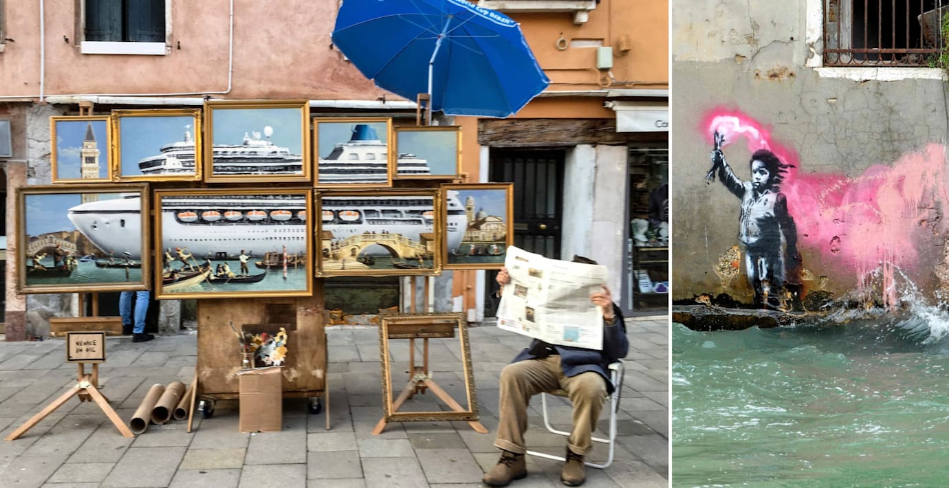 Samtidigt har konstnären lagt ut en video på Instagram där han iförd hatt och lång rock sätter upp ett marknadsstånd där han placerar nio tavlor, som tillsammans utgör en avbildning av ett stort kryssningsfartyg som far fram i Venedigs trånga kanaler. Verket kallas ”Venice in oil” och kan läsas som kritik av massturismen som hotar staden.