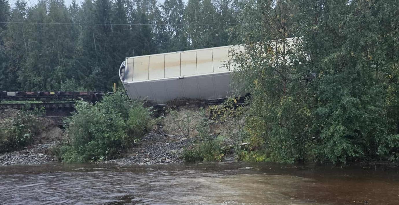 • Minst två godståg spårade ur utanför Örnsköldsvik, varav ett lastat med ammunition och litiumbatterier och det andra med timmer, efter att banvallen spolats bort.