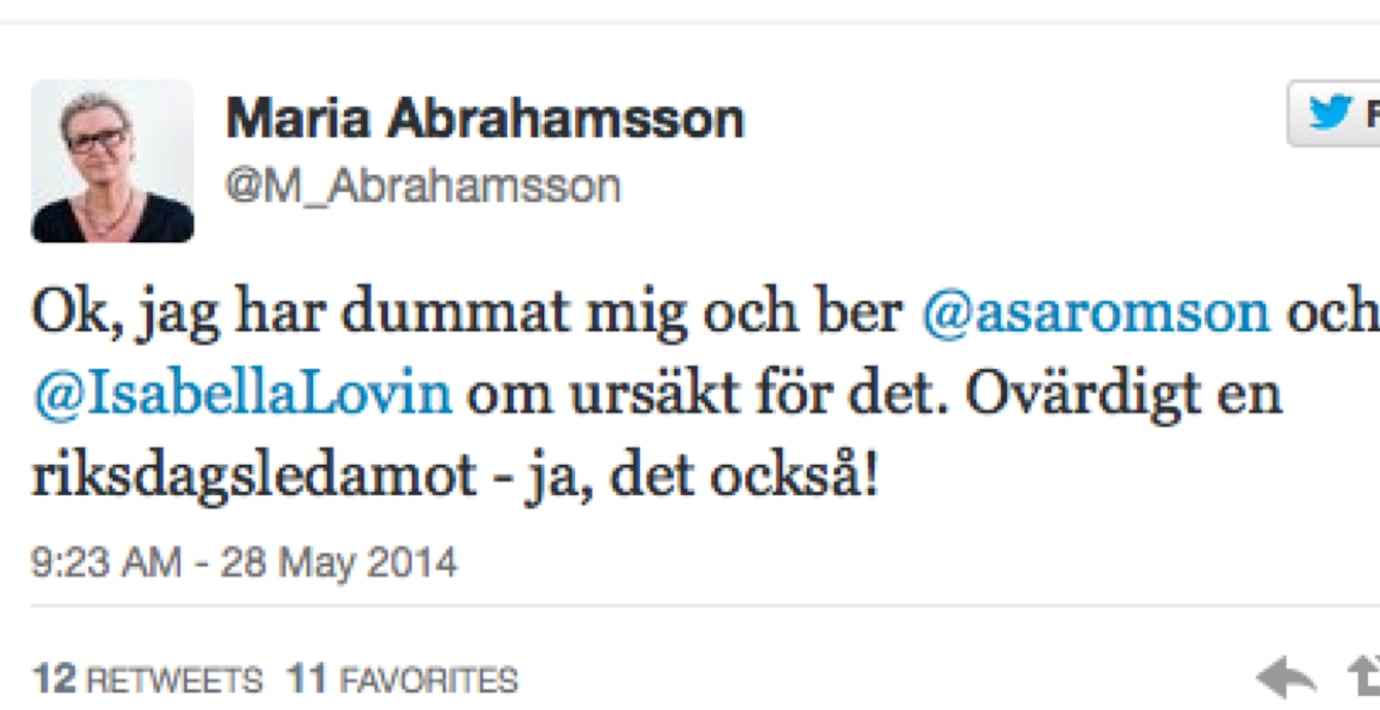 Nu ber Maria Abrahamsson (M) om ursäkt för sitt vikthån mot de miljöpartistiska riksdagskvinnorna. I går skrev Abrahamsson på Twitter: ”som diabetiker drillad men för oss kvinnor går midjemaxet vid 82 cm, sen förhöjd risk för hjärtat och en del annat” till en bild på bland annat Åsa Romson och Isabella Lövin. ”Ok, jag har dummat mig”, skriver M-politikern i dag på Twitter. ”Ovärdigt en riksdagsledamot - ja, det också”, avslutar hon. Under morgonen skrev Maria Abrahamsson också på sin blogg om kritiken hon mottagit för viktpiken. Hon undrar om det inte är lite väl överkänsligt och skriver att Borg hånades för sitt frisyrbyte under en månads tid. ”Men att knysta om en ganska uppenbar rondör är tydligen tabu när det gäller rödgröna politikerkvinnor”, skriver hon.