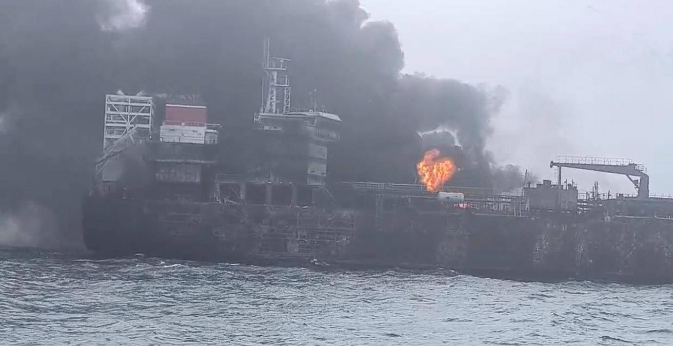 Oljetankern står fortfarande i lågor och brittiska myndigheter oroar sig för ett stort utsläpp.