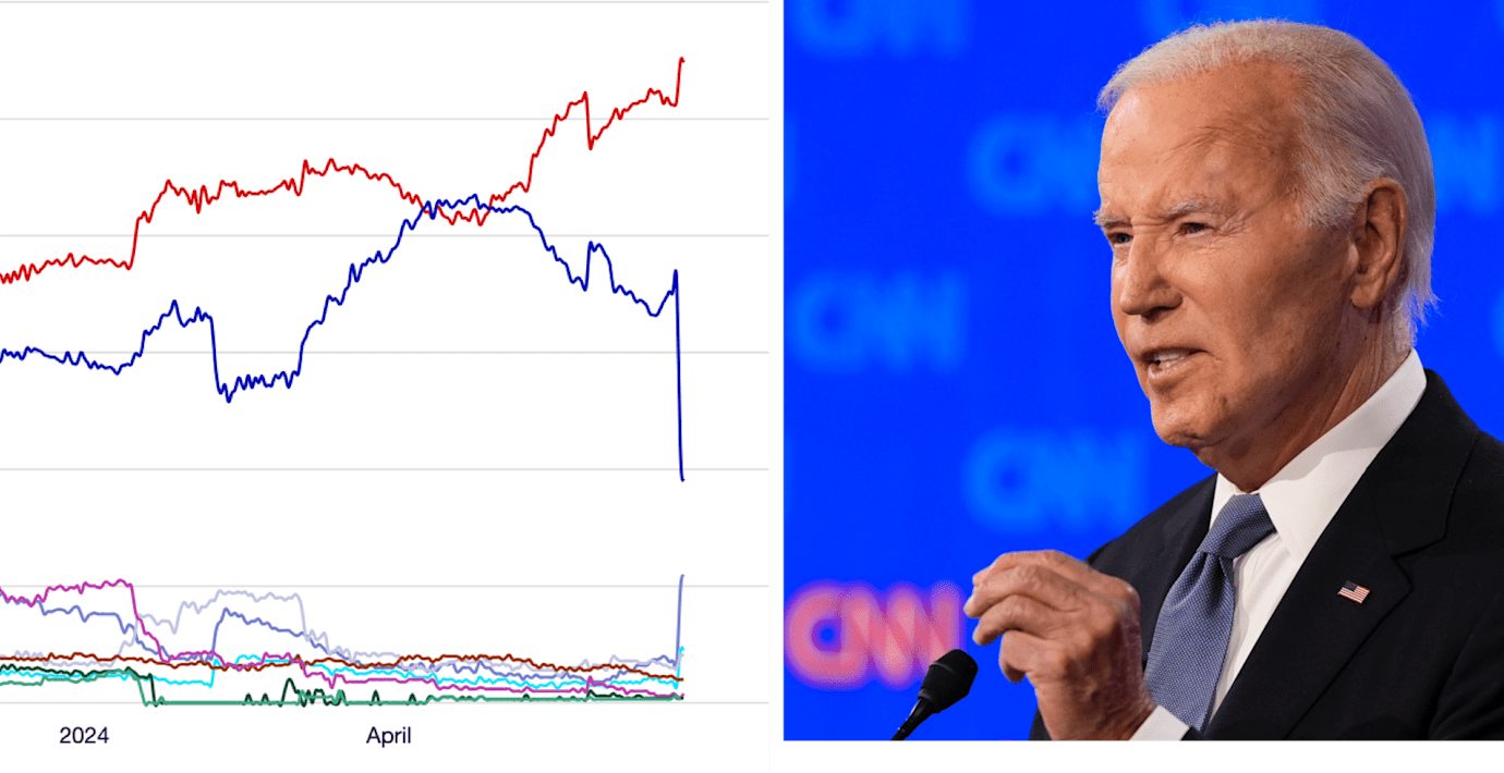 Innan debatten bedömdes Biden ha runt 35 procents chans att vinna och efteråt runt 19. Donald Trump ökade under samma tid från drygt 51 till drygt 54 procents chans att vinna.