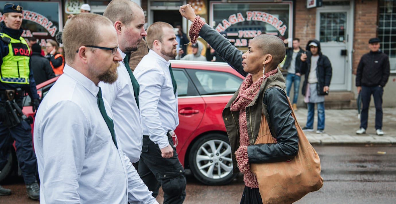 Den har redan kallats för årets bild av många i sociala medier. Bilden visar en kvinna som med knuten näve ställer sig framför en grupp nazister från Svenska motståndsrörelsen i samband med deras demonstration på första maj i Borlänge i helgen.