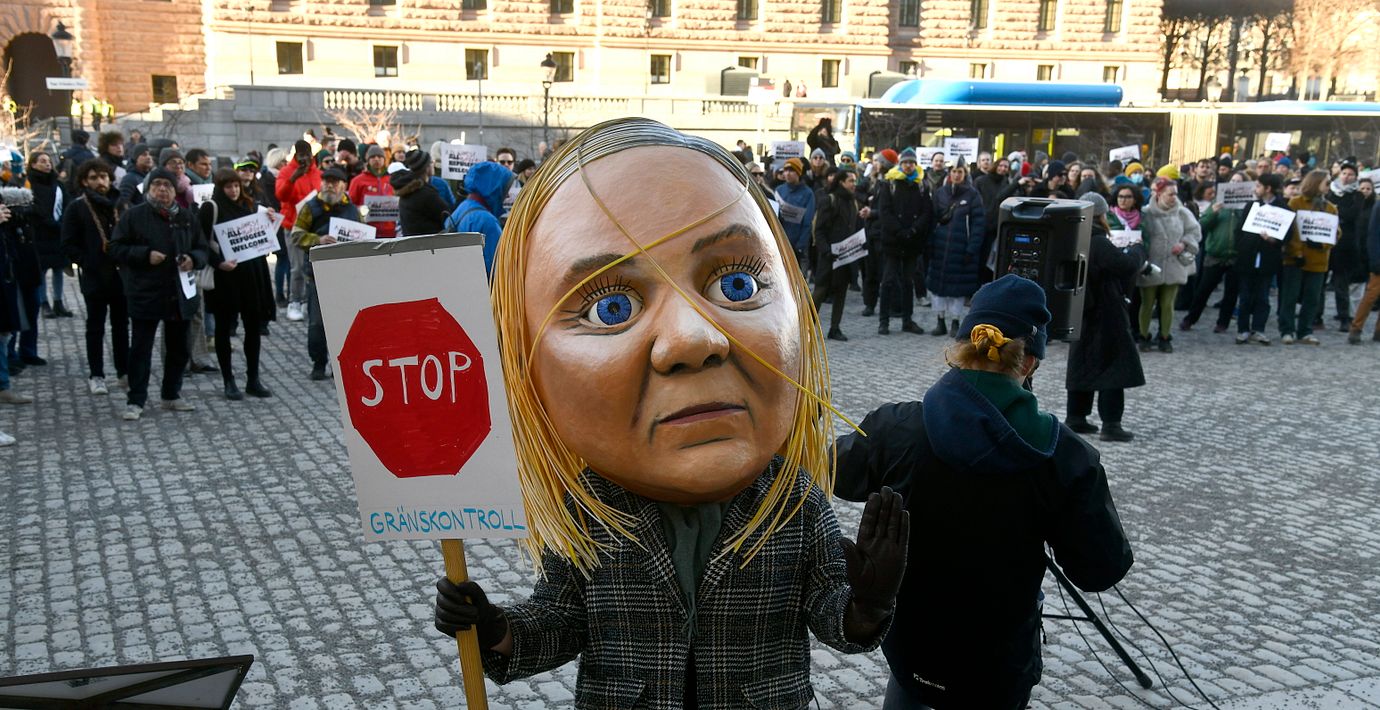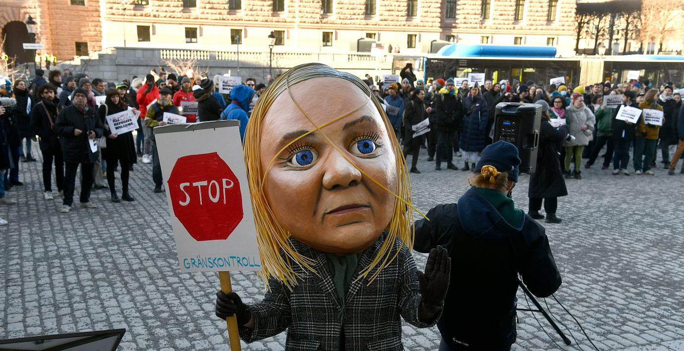 Demonstrationer hölls även i Sverige, här på Sergel torg där en docka föreställande statsministern fanns med, vilket tycks symbolisera kritik mot regeringens flyktingpolitik