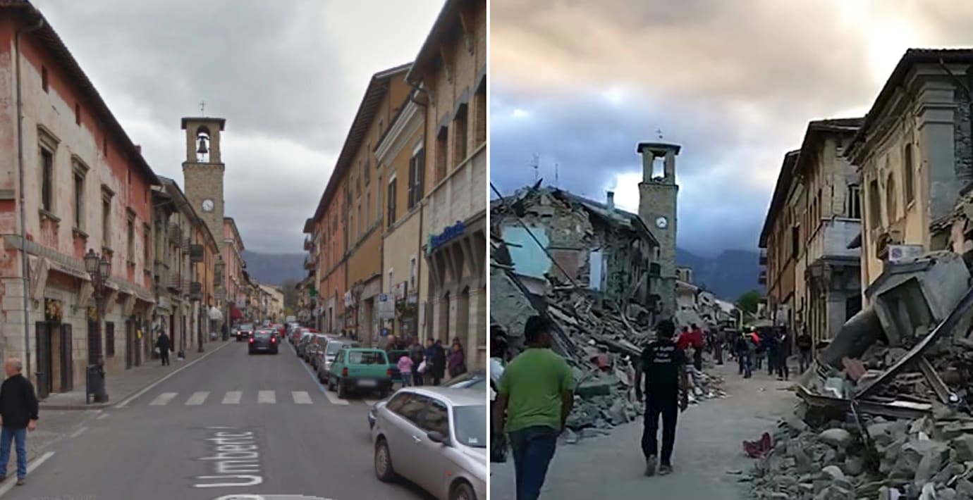 Jordbävningen som skakade centrala Italien på onsdagsmorgonen slog hårt mot flera bergsbyar i Apenninerna. På interaktiva bilder som The Guardian publicerar från före och efter skalvet syns förödelsen på flera platser.