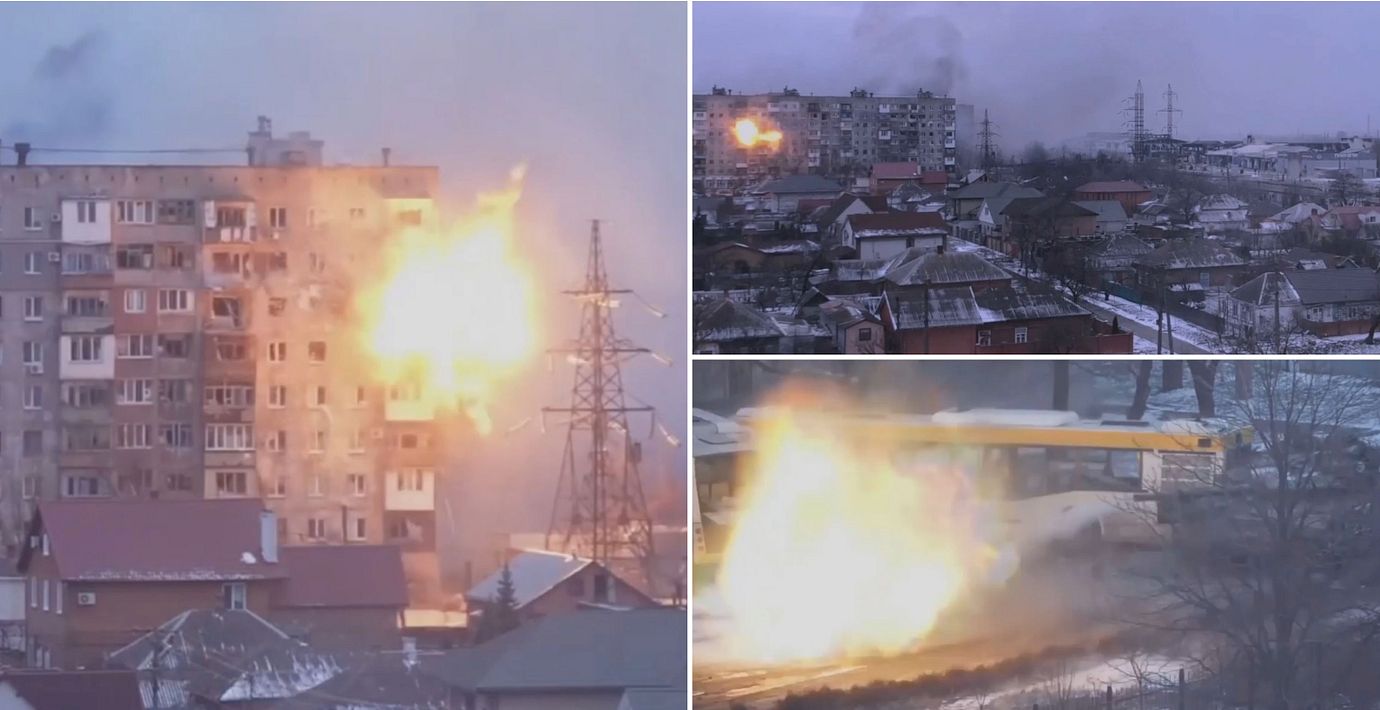Filmklipp från en AP-journalist inne i belägrade Mariupol visar ryska stridsvagnar som beskjuter ett nio våningar högt bostadshus. Skott syns avfyras från marken och i nästan samma ögonblick sker en kraftig explosion i huset. Balkongerna fattar sedan eld, skriver AP.