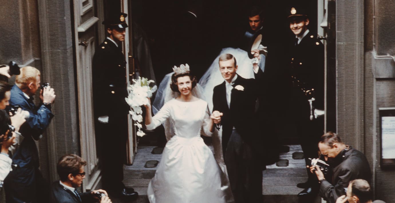 Désirée lämnar kyrkan efter vigseln med Niclas Silfverschiöld 1964