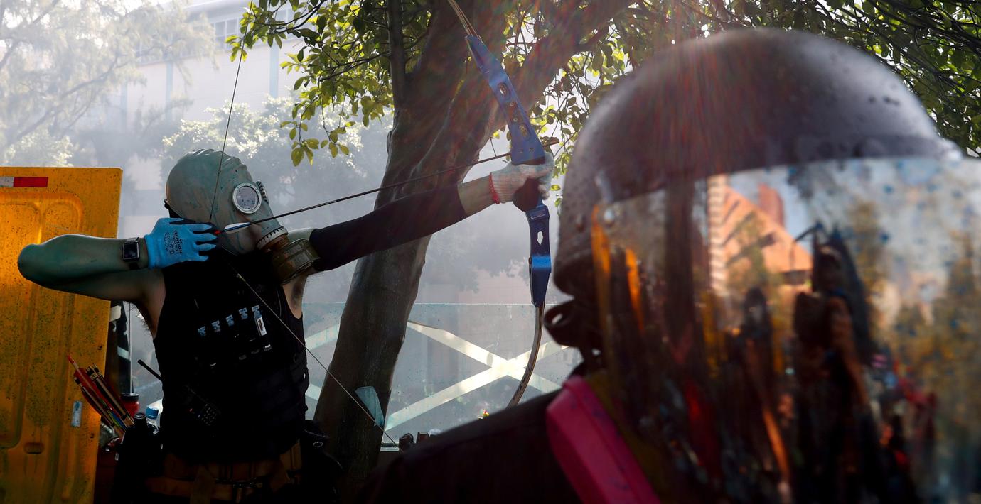 Söndagsmorgonen inleddes med våldsamma protester i Hongkong. Polis har beskjutit aktivister med tårgas och demonstranterna har svarat med bensinbomber.