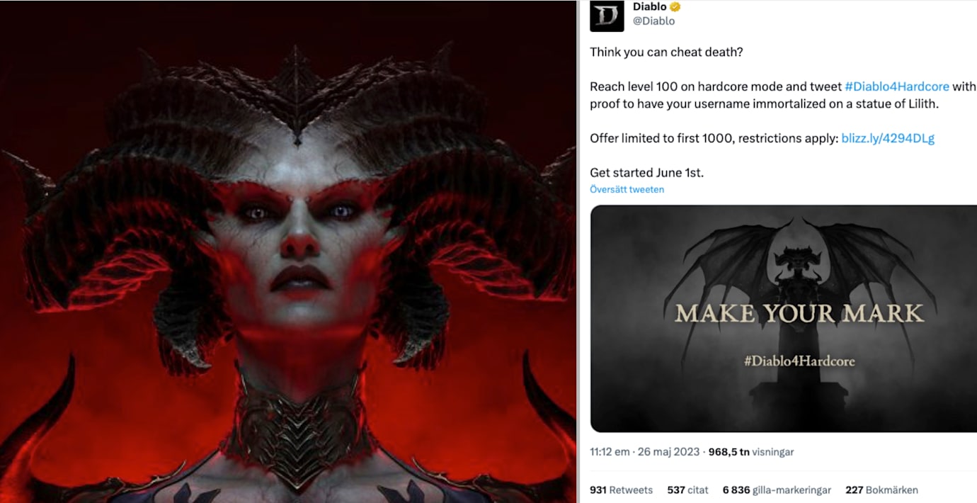 Nu meddelar spelutvecklaren att de tusen första spelarna i världen som når level 100 på spelnivån hardcore – vilket innebär att spelet tar slut så fort din karaktär dör – kommer att få sitt användarnamn ingraverat på en staty av antagonisten Lilith, som är den demon som ska krossas i spelet (och förmodad slutboss).