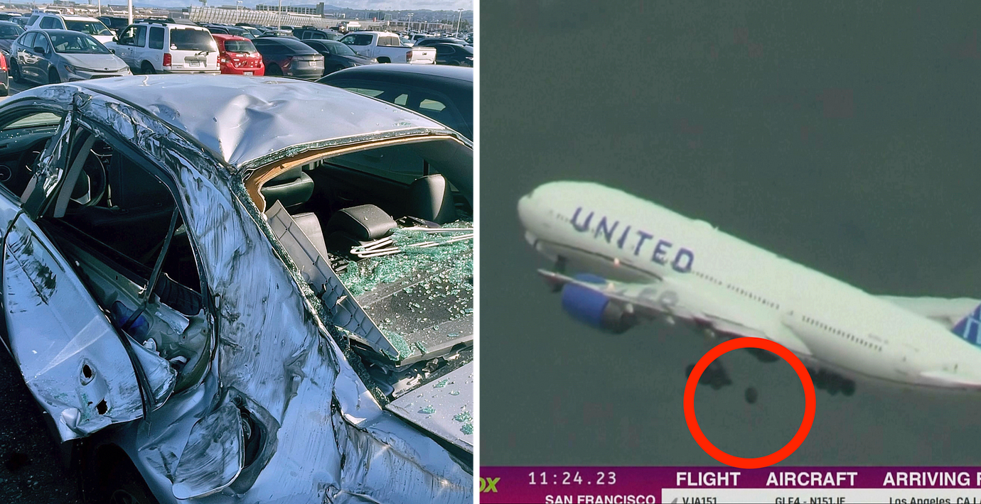 En video visar hur hjulet lossnar från planet, en Boeing 777, bara sekunder efter starten från San Francisco International Airport. Hjulet landade på en parkeringsplats och skadade flera bilar. Ingen människa kom till skada.