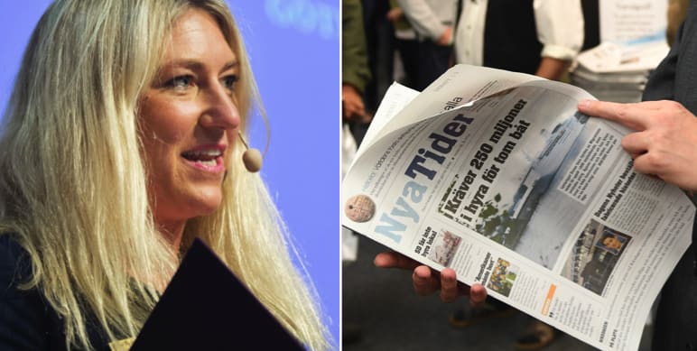Samtidigt kritiserar hon Nya tider för att ha delat ut tidningen i samband med ett seminarium på Internationella torget om flyktingfrågan.