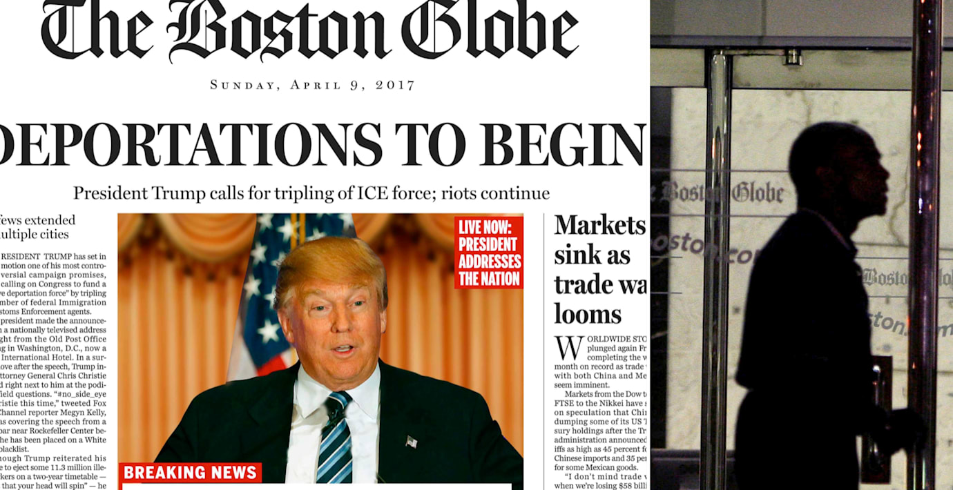 På förstasidan på den ansedda dagstidningen Boston Globe tas ett redaktionellt avstånd från den republikanske presidentaspiranten Donald Trump, skriver Reuters. Satiriska rubriker förutspår Trump som president. ”Nu börjar deporteringarna” lyder en rubrik. ”Börsen faller när handelskrig väntar” heter en annan.
