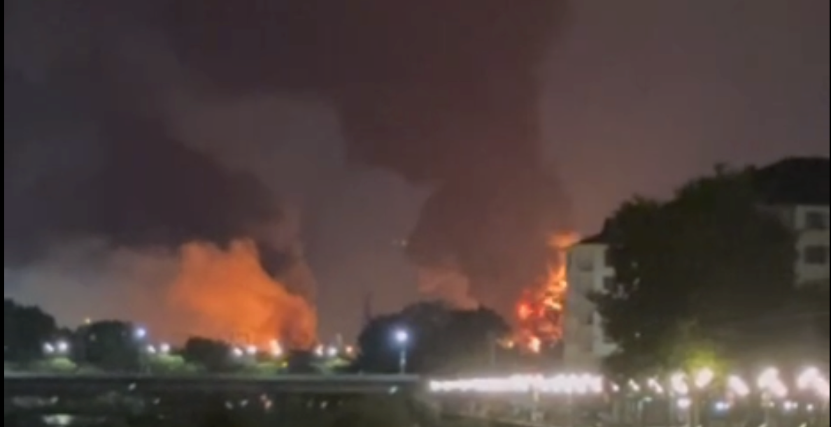 Overifierade videoklipp som sprids i sociala medier visar eldslågor och stora svarta rökmoln stiga över anläggningen.