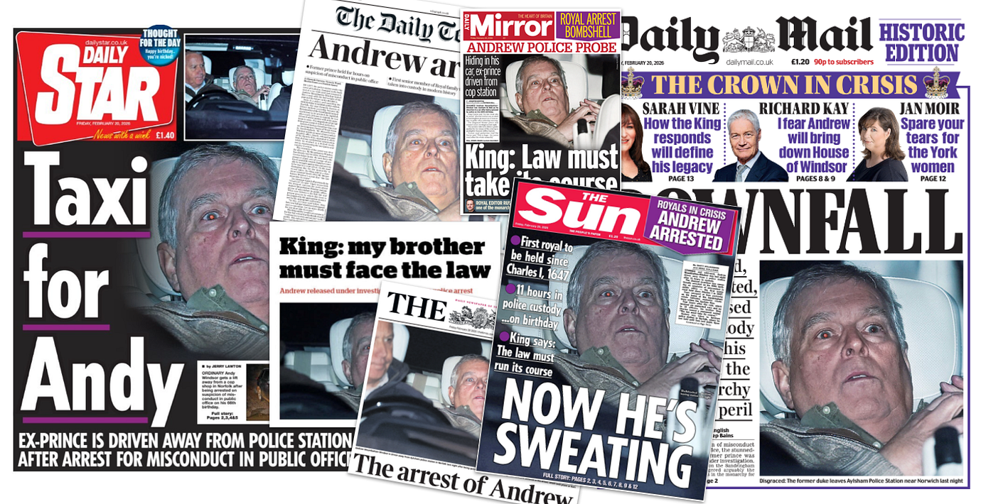 Alla de brittiska tidningarna tapetserar fredagens förstasidor med gripandet av den tidigare prinsen Andrew – och som väntat är det tabloiderna som tar i mest.