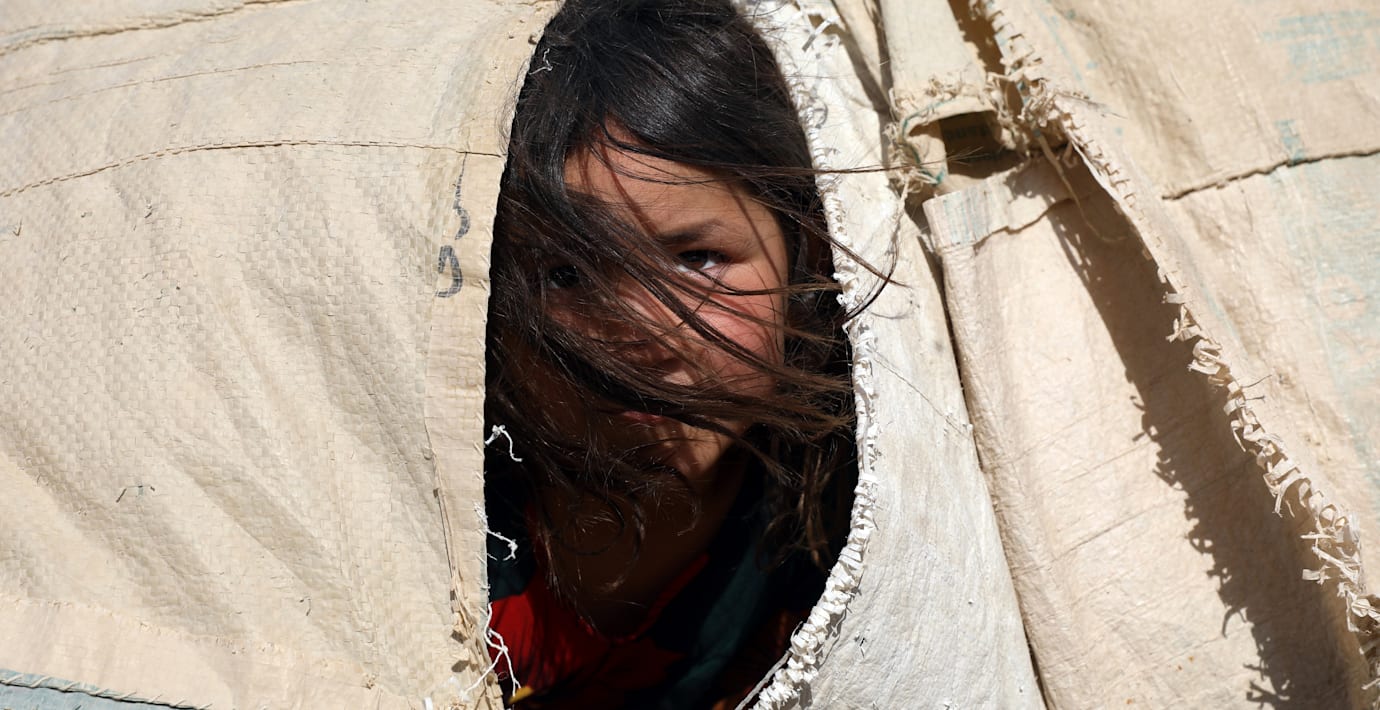 En flicka som flytt undan strider mellan talibanerna och Afghanistans säkerhetsstyrkor. (Rahmat Gul / TT NYHETSBYRÅN)