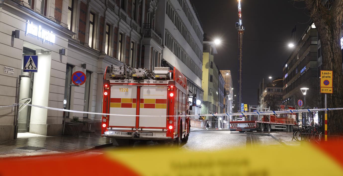 En lyftkran i centrala Stockholm riskerar att välta och flera gator har därför spärrats av, rapporterar Aftonbladet. Restauranger och bostäder har utrymts efter att en vattenledning på Norrlandsgatan sprungit läck.