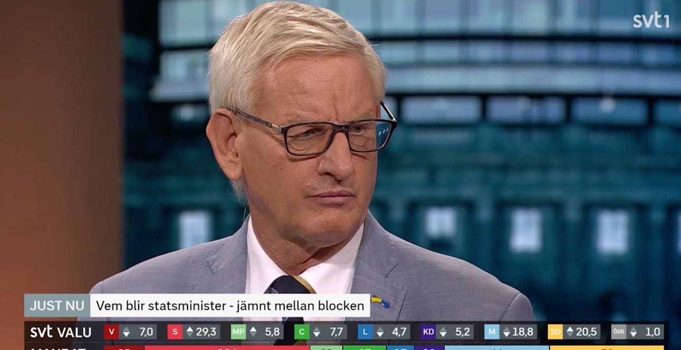 Tidigare moderata statsministern Carl Bildt tror inte att regeringsfrågan blir särskilt besvärlig för M om SD är större, så länge det finns en majoritet för högerblocket. Det säger han i SVT:s valvaka.