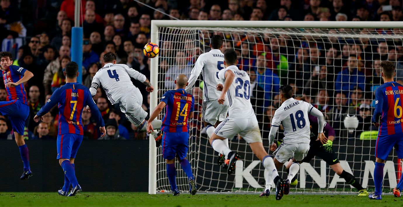 Barcelona såg ut att gå mot seger i eftermiddagens El Clasico mot Real Madrid. Men i den 90:e minuten nickade Sergio Ramos in kvitteringen efter en frispark, och såg därmed till att Real håller avståndet på sex poäng ner till ligatvåan Barca.