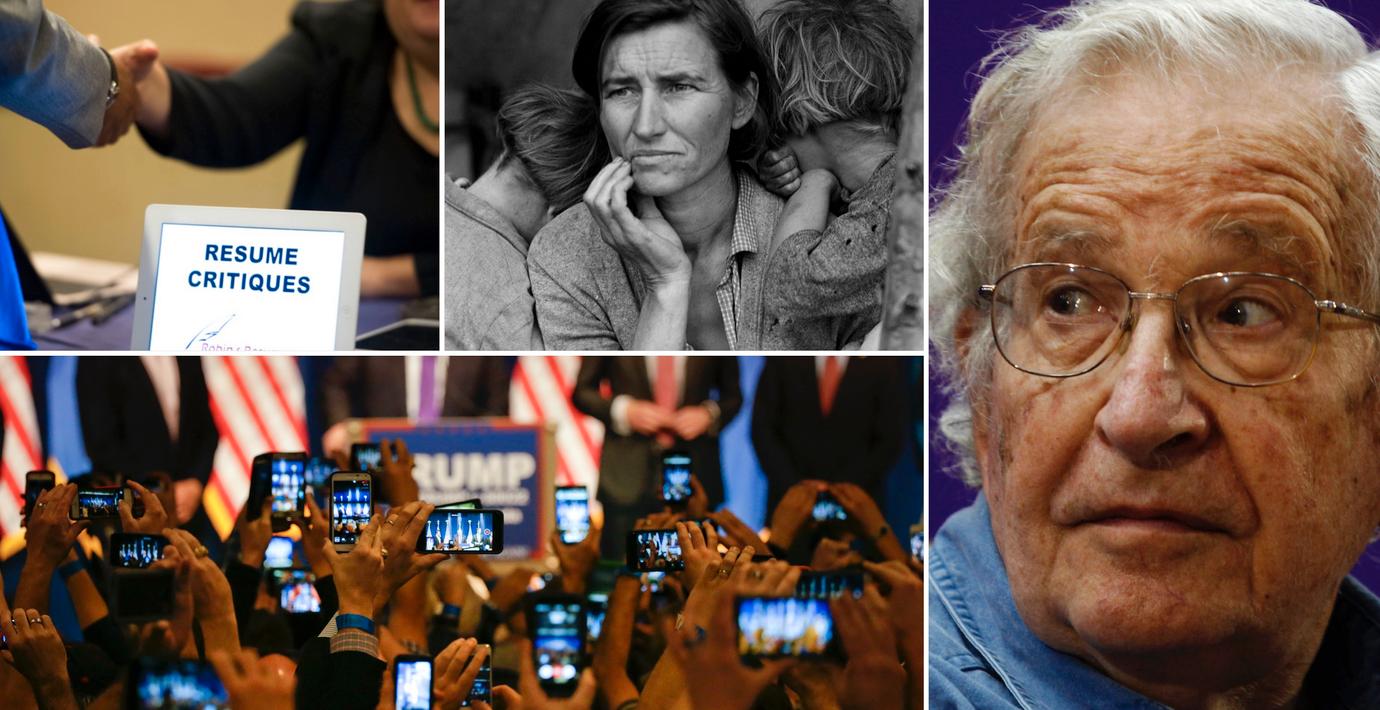 Donald Trumps framgångar i USA:s primärval beror på att ”samhället brutits ned”, säger lingvisten och MIT-professorn Noam Chomsky i en intervju med sajten AlterNet. Samhällsklimatet i dagens USA liknar det efter den stora depressionen på 30-talet, fortsätter han.