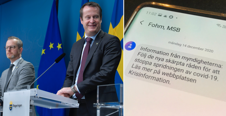 ”Information från myndigheterna: Följ de nya skärpta råden för att stoppa spridningen av covid-19. Läs mer på webbplatsen Krisinformation”, lyder hela budskapet om de skärpta allmänna nationella råden som träder i kraft i dag.