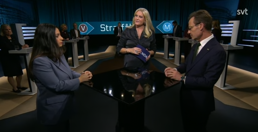 Förra helgens skjutning i Gävle, där en 13-åring tros ha hållit i vapnet, visar att det är rätt att sänka straffbarhetsåldern till just 13 år, säger statsminister Ulf Kristersson (M) i en duell i SVT:s partiledardebatt med Nooshi Dadagostar (V).