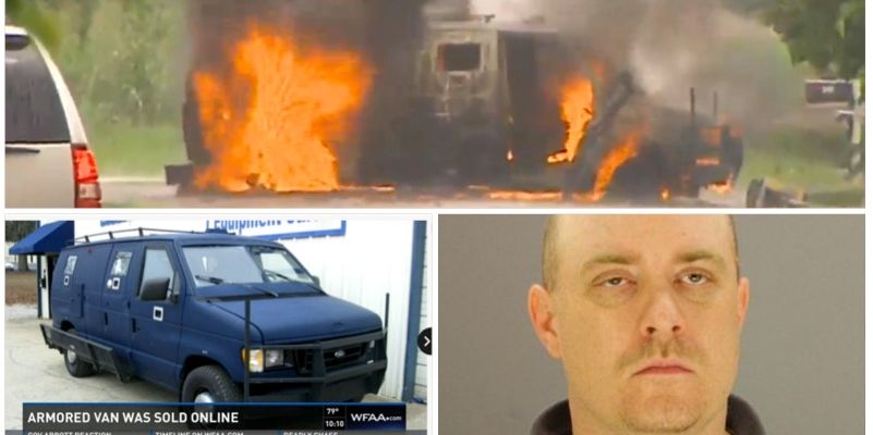 Den bepansrade bil Boulware tidigare hade kört runt i tog eld och fick brinna ut, eftersom den var proppfull med sprängmedel och ammunition, uppger polisen.