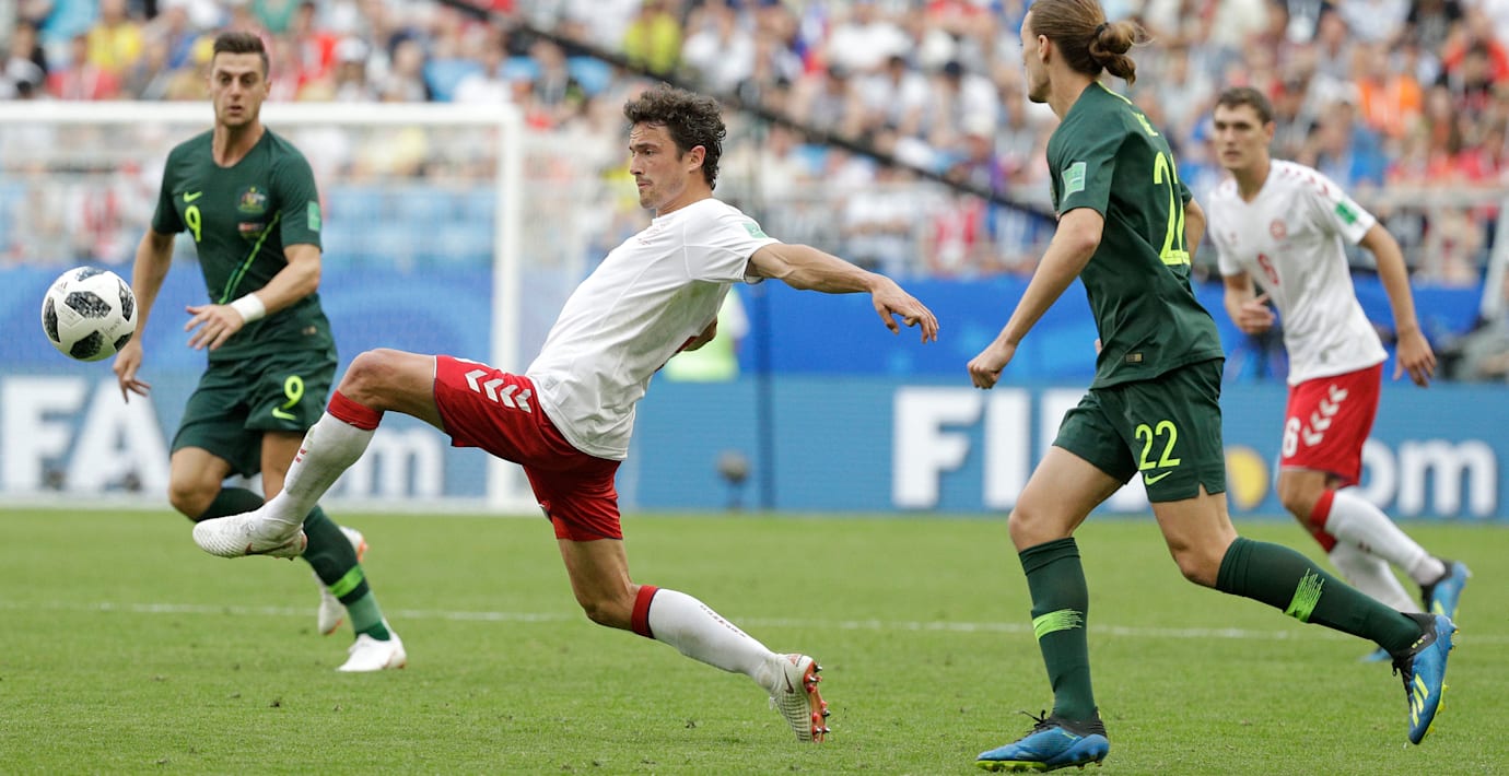 Men ett försvarsstarkt Danmark, som inte släppt in ett mål på fem matcher, fick ge vika i slutet av den första halvleken. Premiärmålskytten Yussuf Poulsen orsakade, efter videogranskning, en straff på grund av hands och Australiens Mile Jedinak var iskall från straffpunkten för andra matchen i rad.