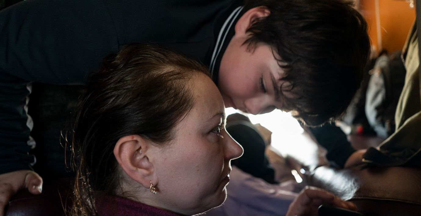 Marina Galla och hennes son flydde det sönderbombade Mariupol. Den 13-årige sonen stryker sin mamma över pannan när hon gråtande berättar för nyhetsbyrån AP: