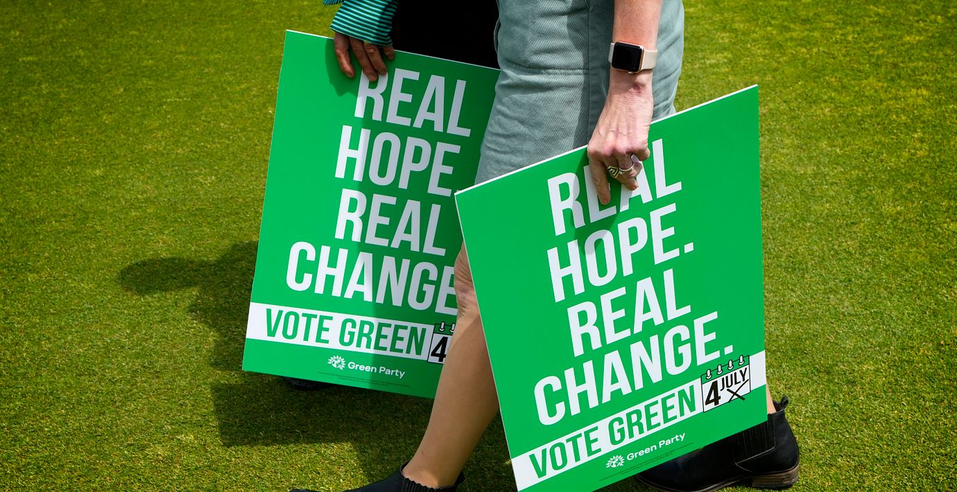 I den senaste opinionsundersökningen från Yougov hamnar De gröna på en delad andraplats tillsammans med De konservativa. Reform UK kommer först och styrande Labour hamnar på fjärde plats.