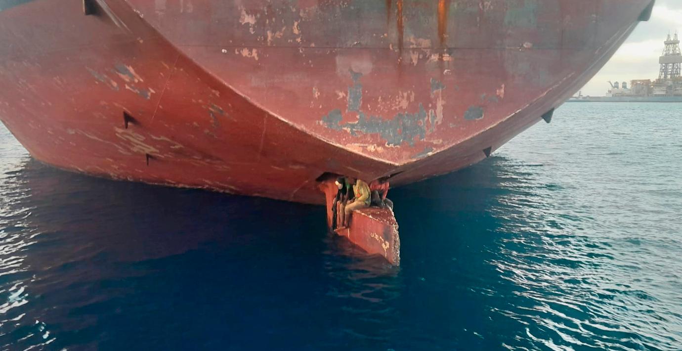 Bilden har förvånat och förskräckt. De tre männen som syns sitta hopträngda på rodret på oljefartyget som ligger för ankar i Las Palmas ska ha tillbringat elva dagar i det lilla utrymmet bara meter över havsytan, för att ta sig från Nigeria till Spanien.