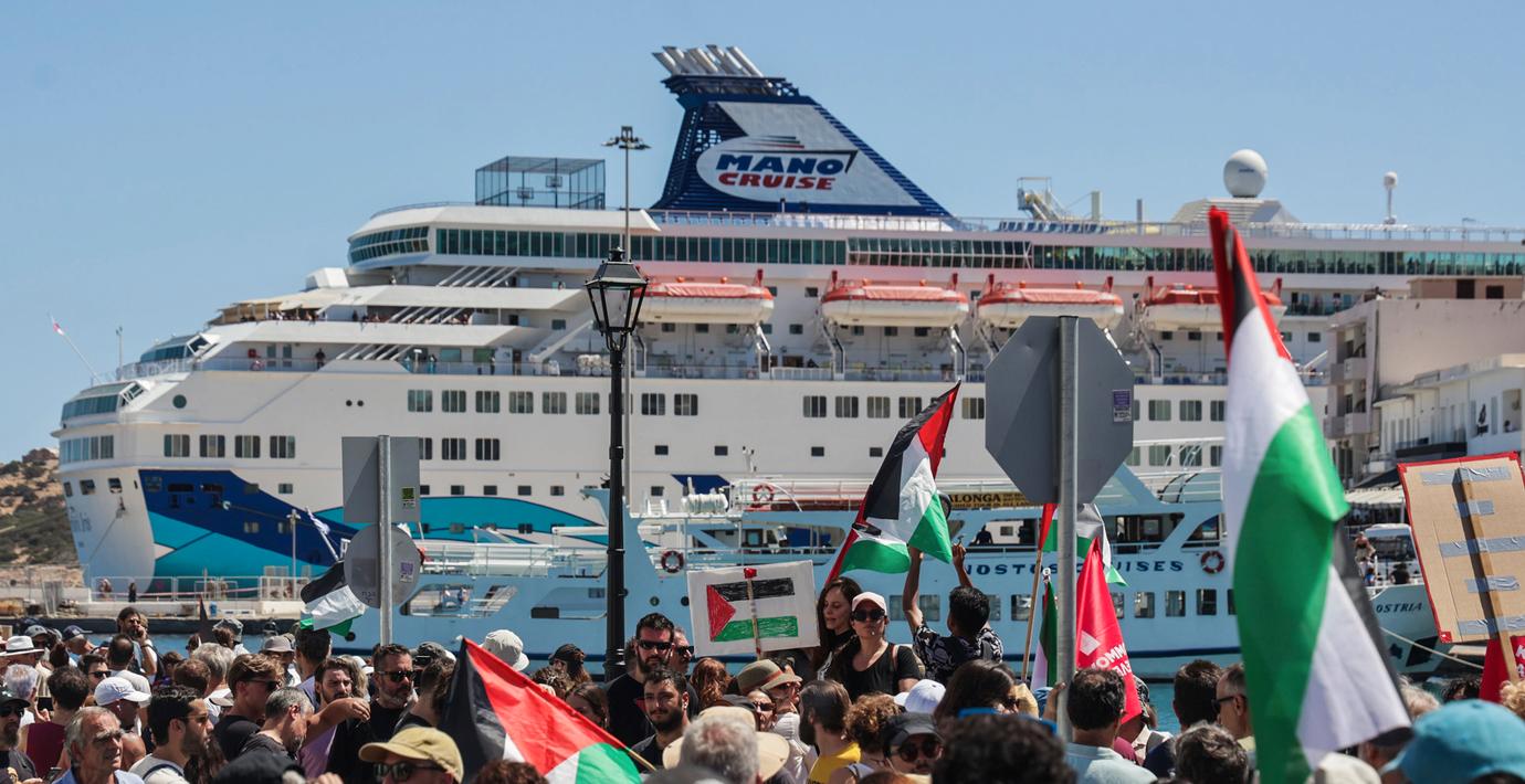 Ett kryssningsfartyg med israeliska turister möttes av pro-palestinska demonstranter när de gick i land på ön Kreta under tisdagen, rapporterar AP. Demonstranterna vecklade ut en enorm palestinsk flagga i hamnen i Agios Nikolaos och ropade ”Free, free Palestine”.